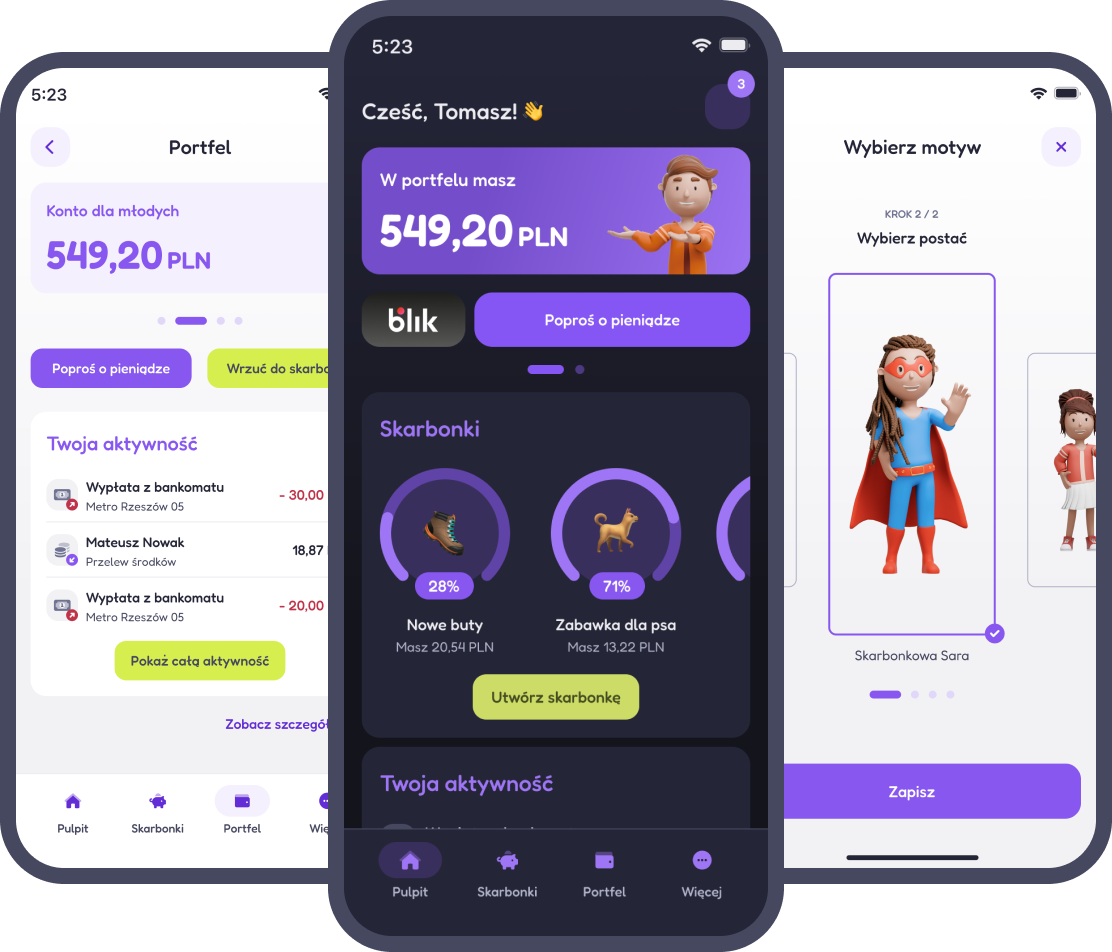Łatwo sprawdza stan Portfela, aktywności na rachunku i informacje o karcie. Wybiera 1 z 4 towarzyszy bankowania i ma dostęp do 10 motyów kolorystycznych.
