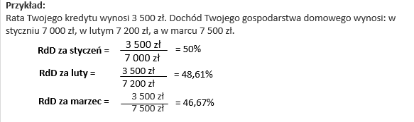 - Twój średni wskaźnik RdD przekracza 30%. Wyliczając go, weź pod uwagę średnią wartość wskaźnika RdD z ostatnich 3 miesięcy, które poprzedzają miesiąc złożenia wniosku o wakacje kredytowe lub;