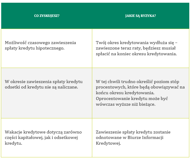 Wakacje kredytowe dotyczą zarówno części kapitałowej, jak i odsetkowej kredytu. Terminy na spłatę rat zostaną przedłużone bez żadnych dodatkowych kosztów.
