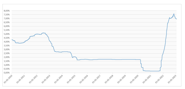 Wykres notowań wskaźnika referencyjnego - stawki WIBOR 3M w latach 2010-2023r.
